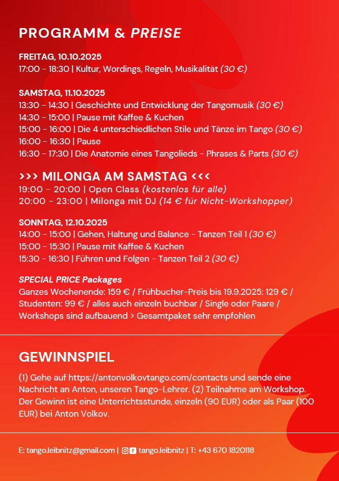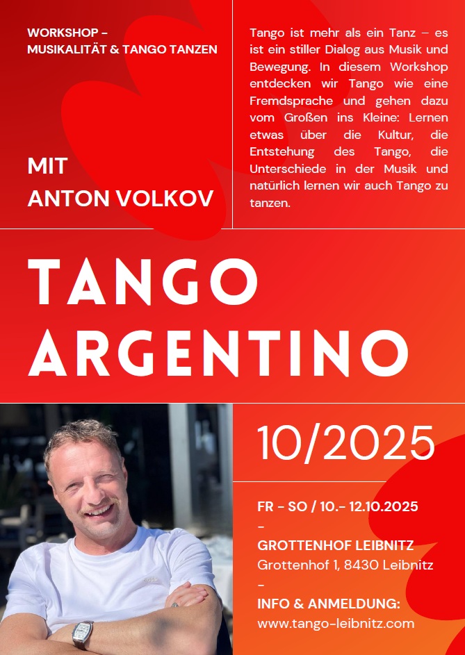 Zur Eröffnung der neuen Tangoszene in Leibnitz laden wir herzlich ein zum TangoWochenende am 10.-12.Okt 2025 in Leibnitz: